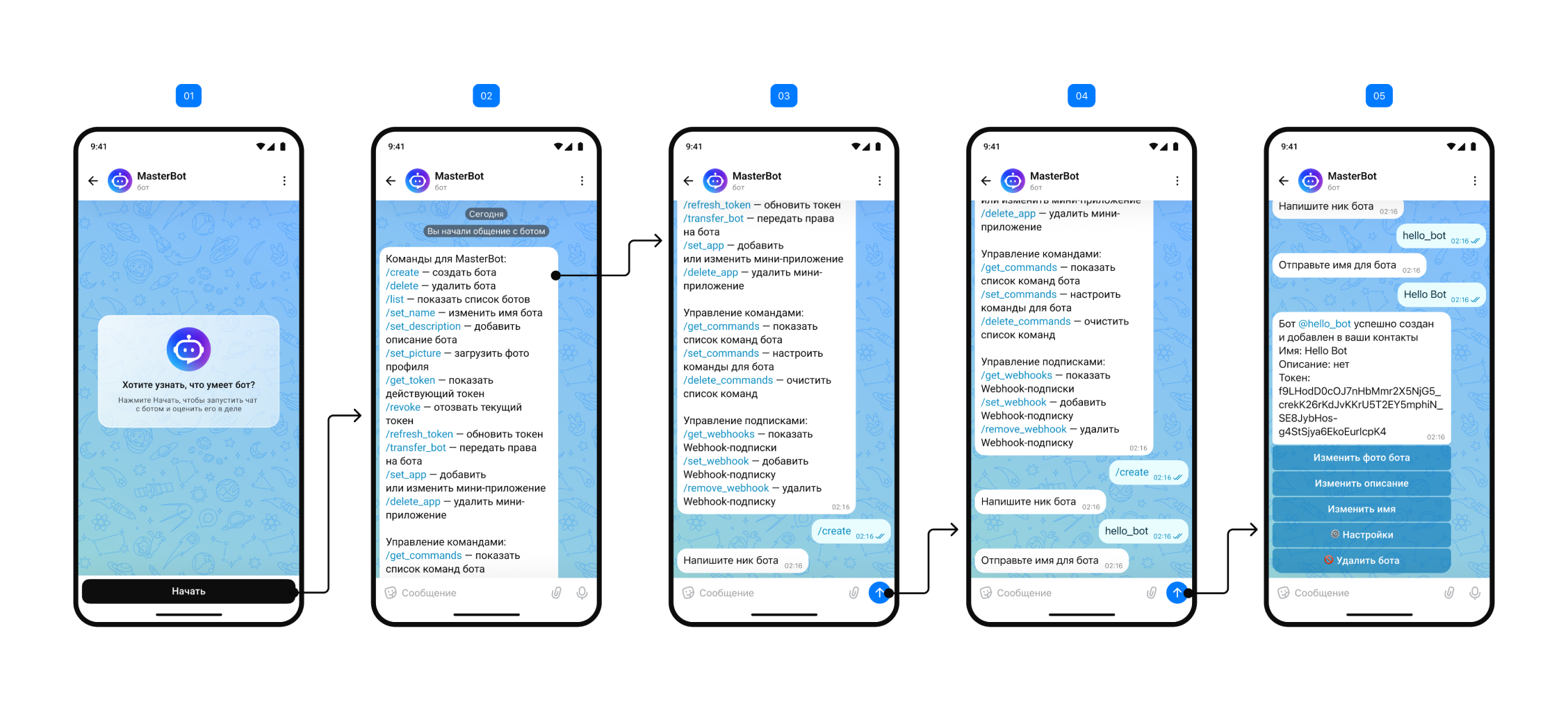 5. Как только @MasterBot получит имя, вам придёт токен — уникальный идентификатор бота, с помощью которого он будет взаимодействовать с API MAX. Наличие токена означает, что бот зарегистрирован в MAX