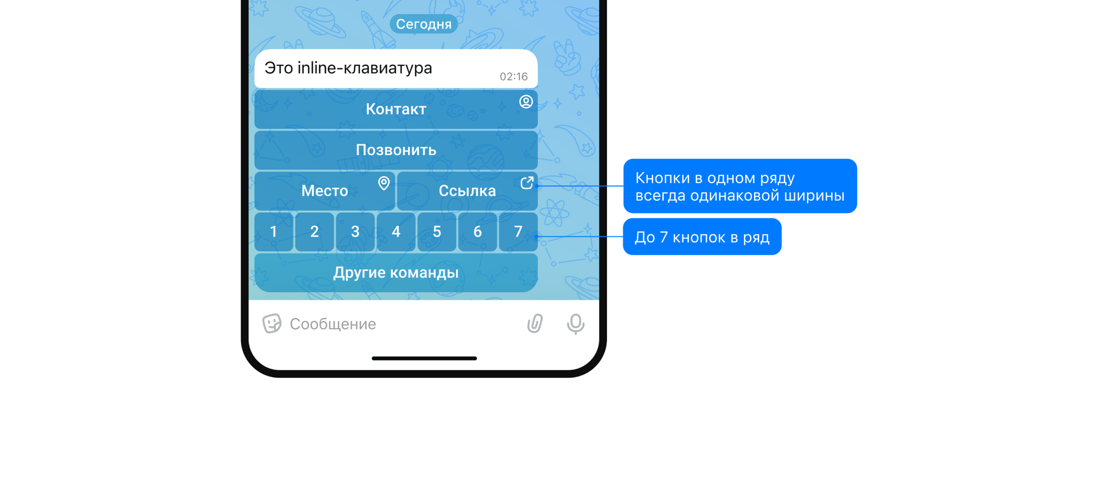 Такая клавиатура может иметь до 210 кнопок, сгруппированных в 30 рядов — до 7 кнопок в каждом (до 3, если это кнопки типа link, open_app, request_geo_location или request_contact). Если ряды кнопок не помещаются в плейсхолдер клавиатуры, автоматически подключается скролл